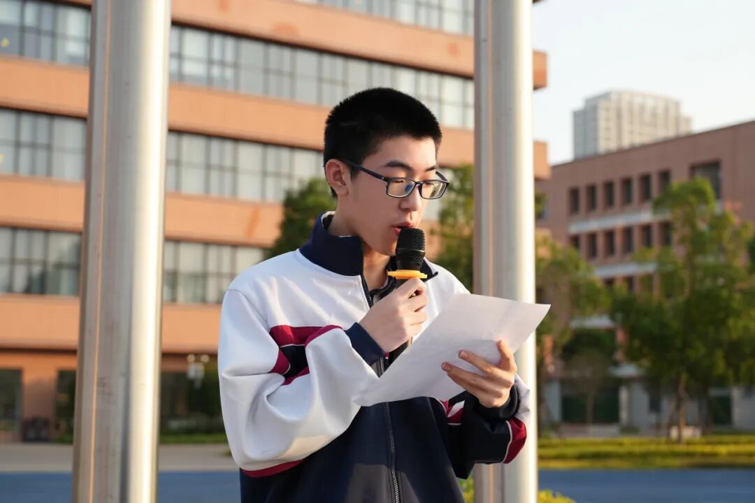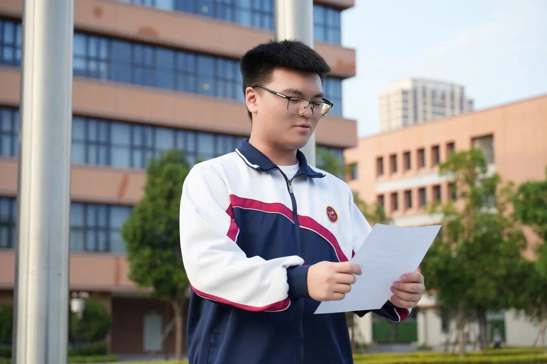 高三卓越班的同学们代表全体福外高中学子,在国旗下庄重宣誓:“我将以实际行动践行誓言,把节约粮食从口号落实到每一顿饭、每一次用餐中,让节约成为一种自觉、一种素养、一种责任,用点滴行动守护粮食安全!”