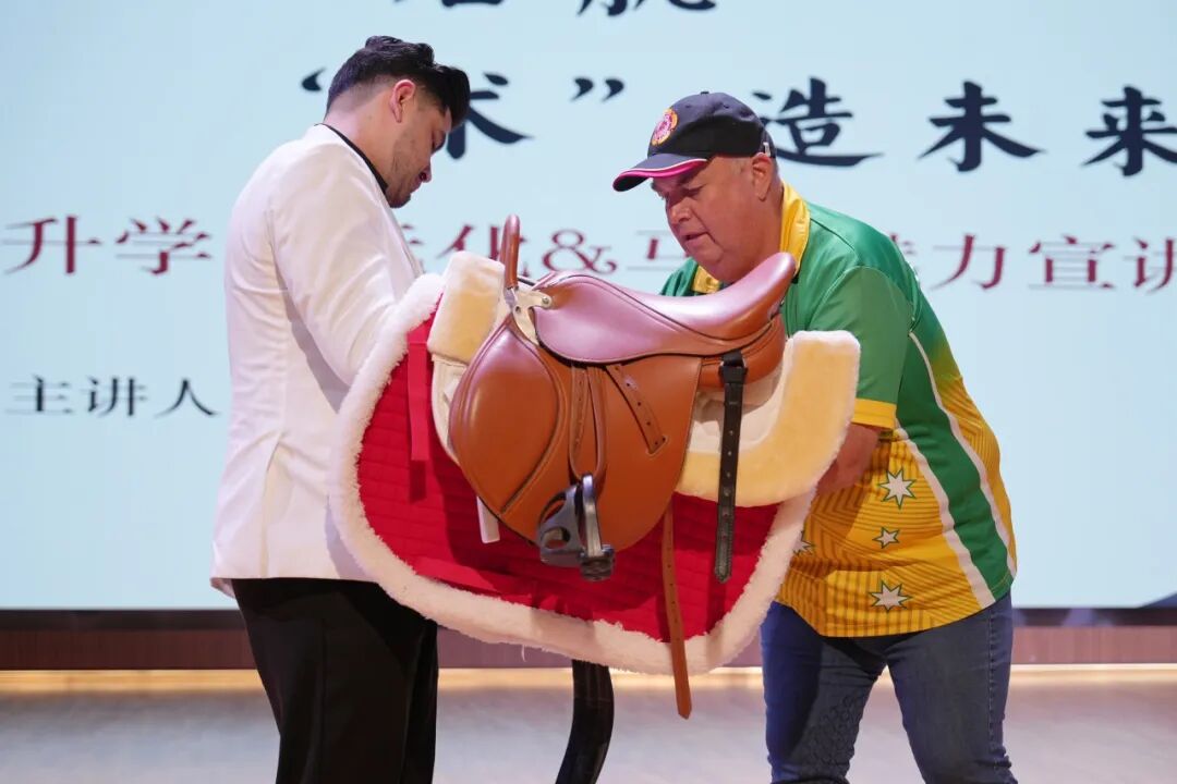 保罗用生动易懂的方式,讲解了多种常见的马匹毛色及标识,并通过对三匹示范马匹的特征解析,引导学生主动思考。同时,他还在现场演示了马鞍、缰绳、鞍垫等装备的正确佩戴方法,进一步加深了大家对马术道具用法的理解。