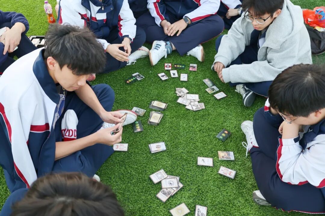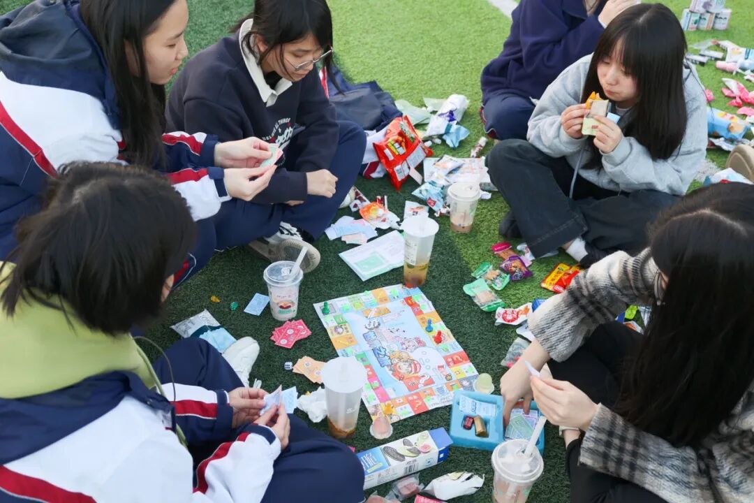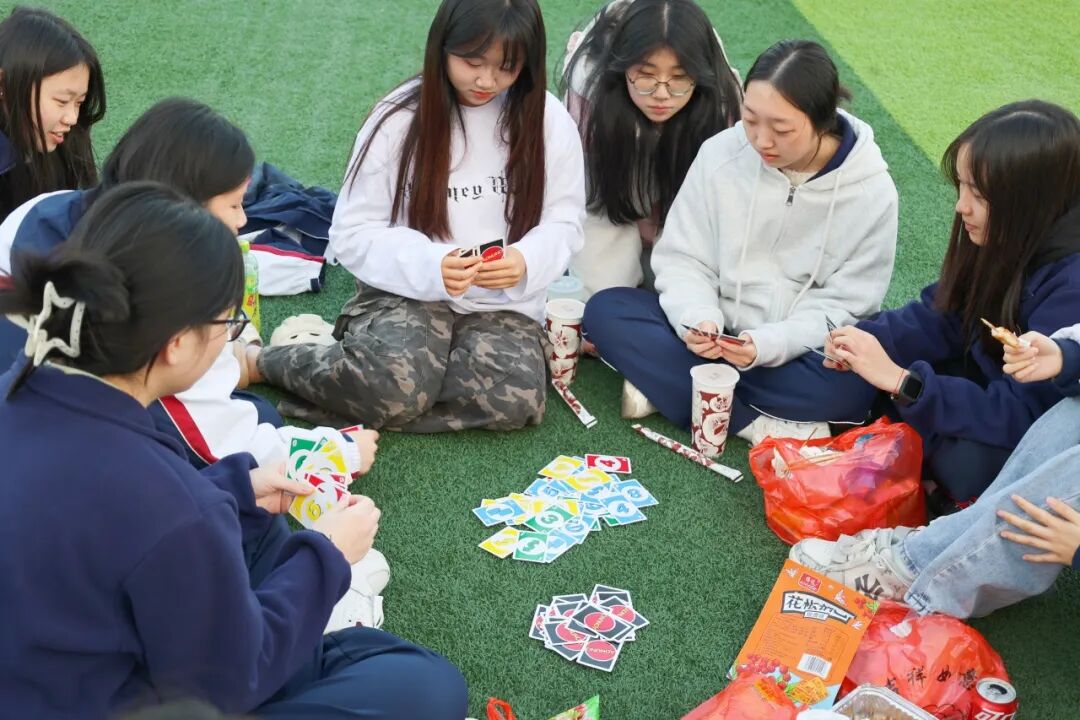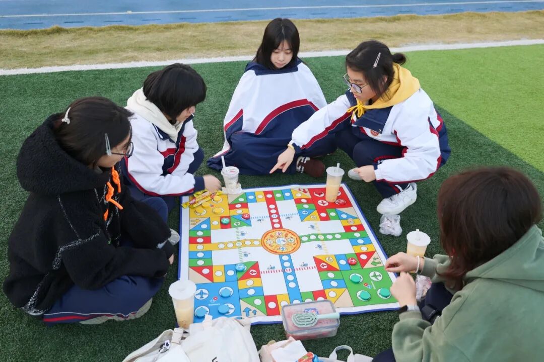 操场四周的自由“快充区”,是师生们的放松净土。大家带着野餐垫、小毯子和靠枕,三三两两围坐在一起,分享着提前准备的水果、零食和饮料,阳光洒在身上,微风拂过脸颊,欢声笑语充斥校园。真心话大冒险、飞行棋、狼人杀等经典游戏轮番上演,师生们自由组队、踊跃参与,在无拘无束的互动中打破了隔阂。不少同学更拿起相机,定格下了这些治愈瞬间。