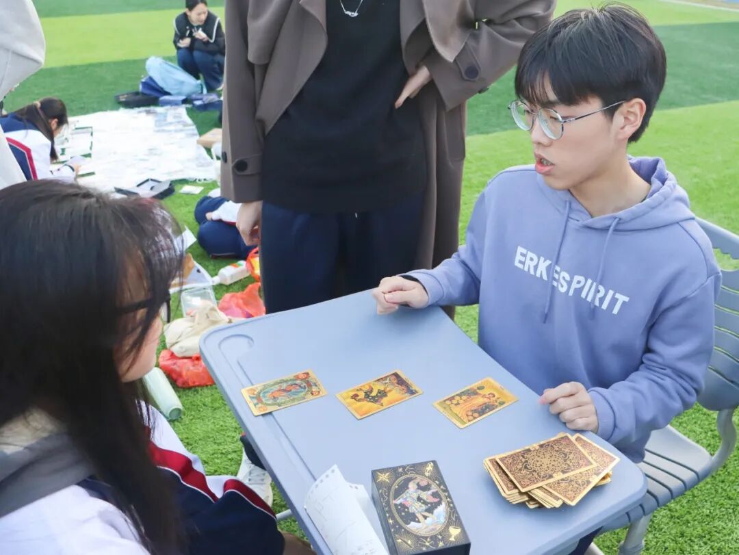 最具氛围感的当属“占卜”摊位!“小占卜师”认真端坐,巧用心理学知识为大家分析和解答青春的小困惑、同时送上满满的好运祝福,不管是关于学习的期许还是对生活的好奇,都能在这里得到温柔回应。