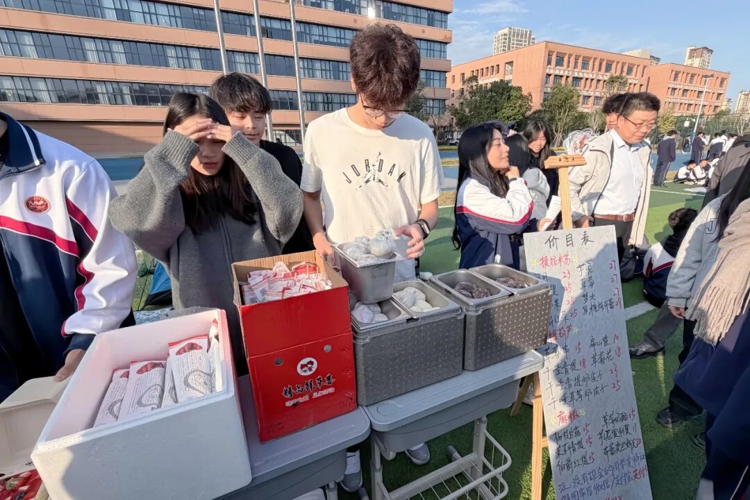 操场中央的市集区堪称本次活动的“人气担当”!各班精心布置的摊位前人头攒动,好物琳琅满目,舌尖美味、潮玩好物与趣味占卜齐聚,承包了整场活动的欢乐与惊喜。