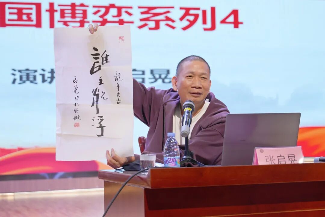 随着讲座深入,张老师现场展示了自己亲笔书写的毛笔字——“谁主沉浮”,瞬间吸引了全场师生的目光。张老师介绍道,这四个字来源于毛泽东的经典诗词,原句“问苍茫大地,谁主沉浮?”充满了对国家命运的深刻思考和对革命力量的坚定信念。