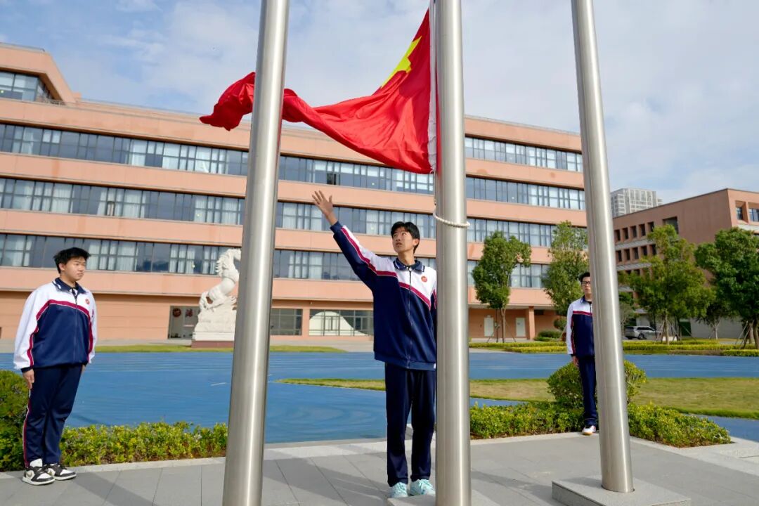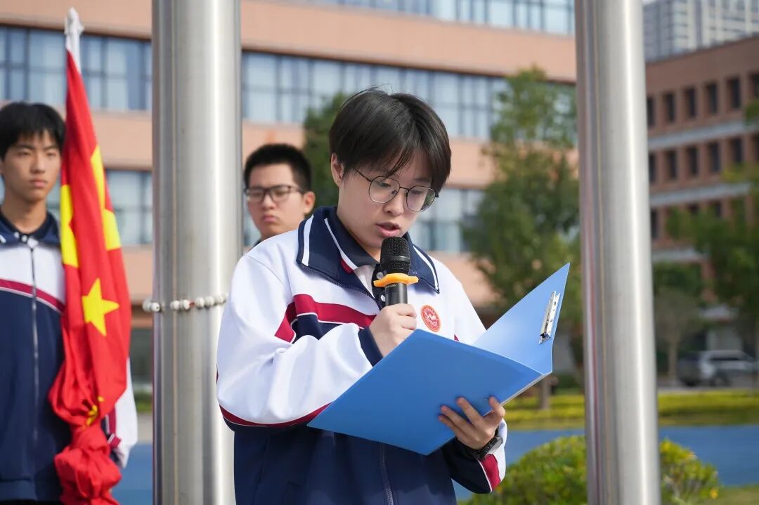 高一(4)班的的同学们代表全体福外高中学子,在国旗下庄重宣誓:“秉感恩之心,修君子之德;以少年意气,筑强国之基!”